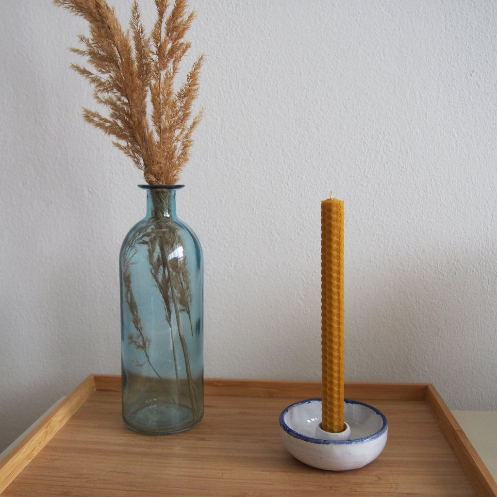 Ručně točený keramický svícínek, který je jako stvořený pro dlouhé stáčené svíčky z včelího vosku. Keramický svícen v sobě spojuje pečlivost ruční výroby s estetikou, která podtrhne atmosféru vašeho domova.