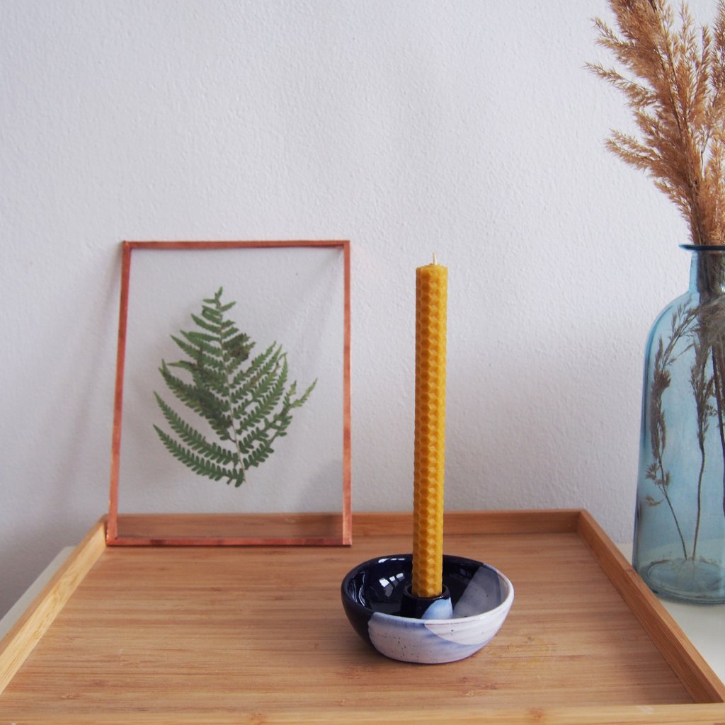 Keramický svícínek navržený speciálně pro dlouhé stáčené svíčky z včelího vosku. Velikost svícnu je kolem 8 cm a vnitřní průměr je kolem 1,5 až 2 cm. K dostání i v dalších barevných kombinacích.